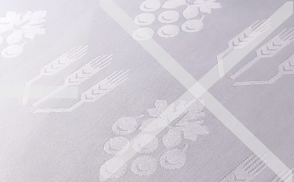 Ons Avondmaalslinnen is verkrijgbaar in het motief Franse lelie of zonder motief (effen wit Avondmaalslinnen). Voorheen was het Avondmaalslinnen ook verkrijgbaar in het motief Druiventrossen en Korenaren. Vanaf januari 2026 is het helaas niet meer mogelijk om kerklinnen in dit motief voor u te maken. In verband met té hoge productiekosten voor de stof met het motief Druiventrossen en Korenaren hebben we helaas moeten besluiten om deze stof niet meer te laten produceren voor ons bedrijf.